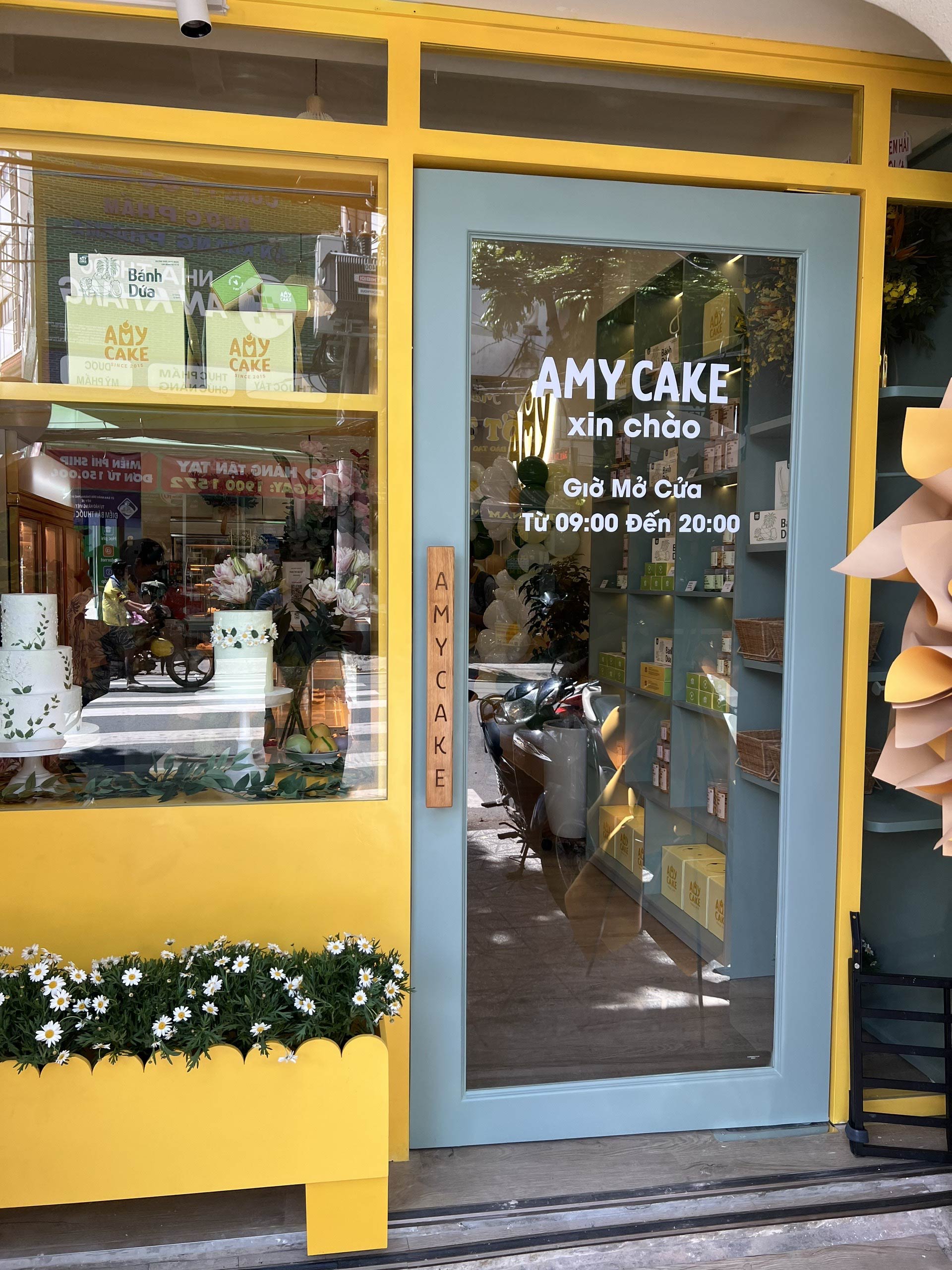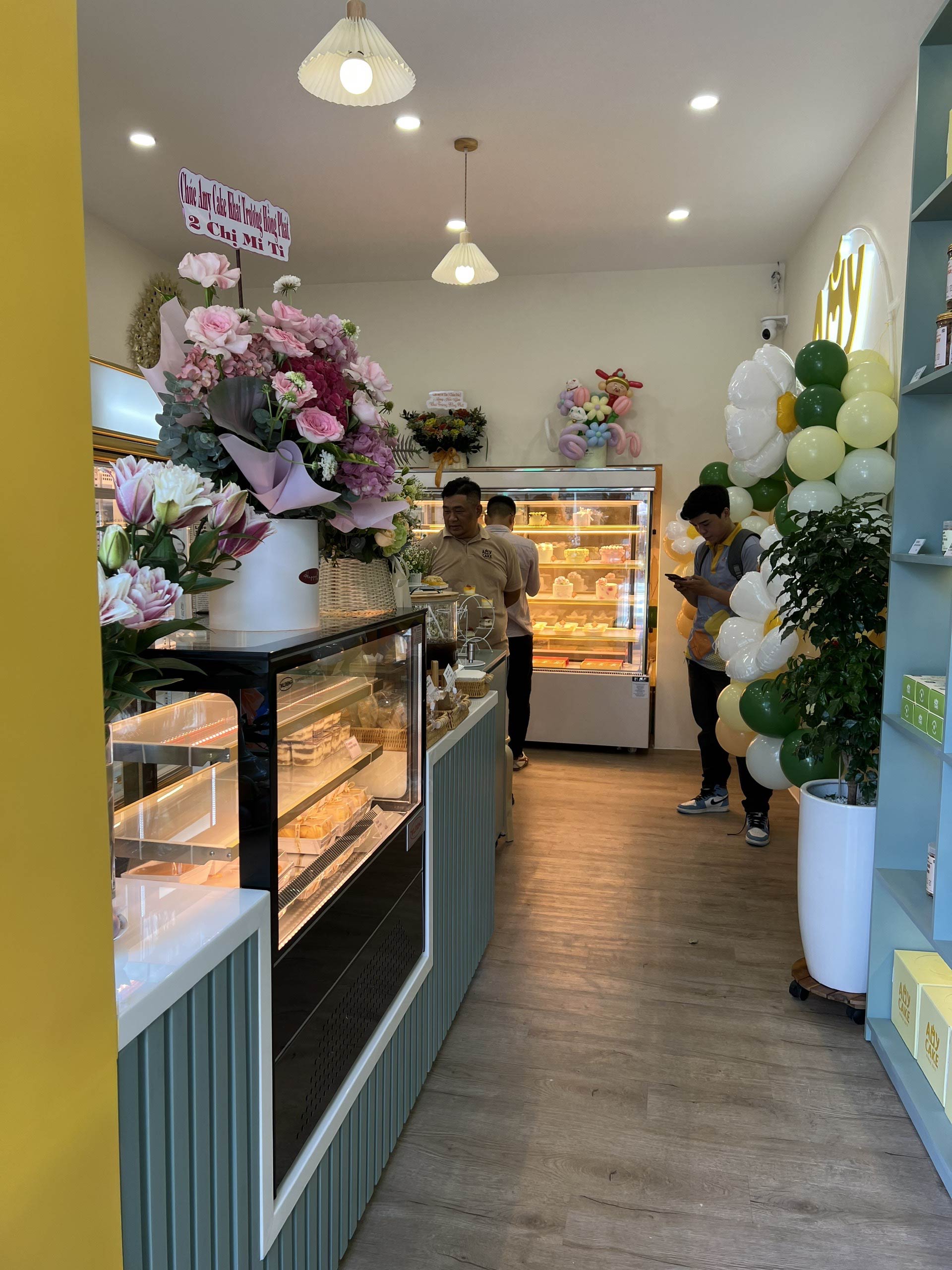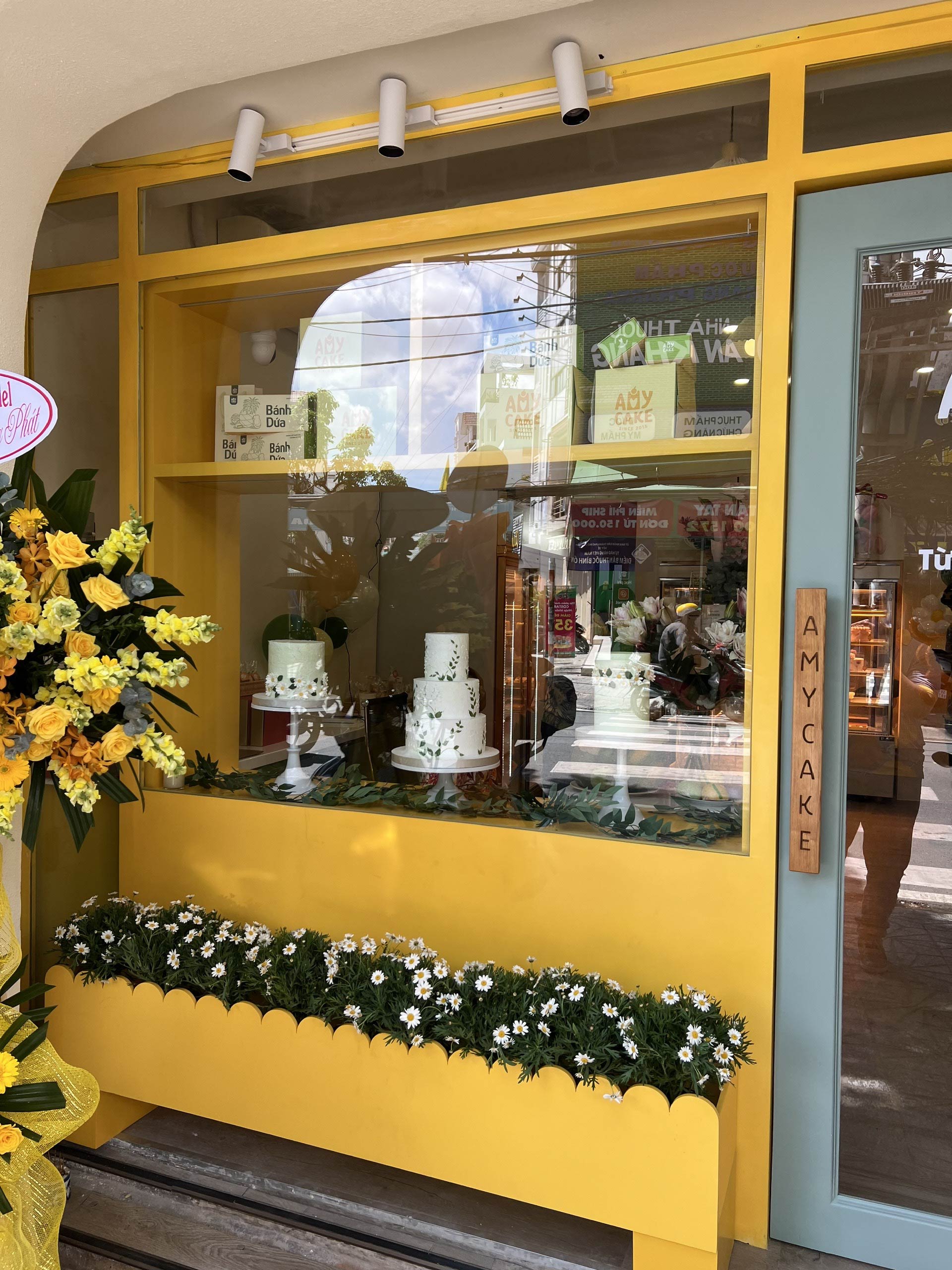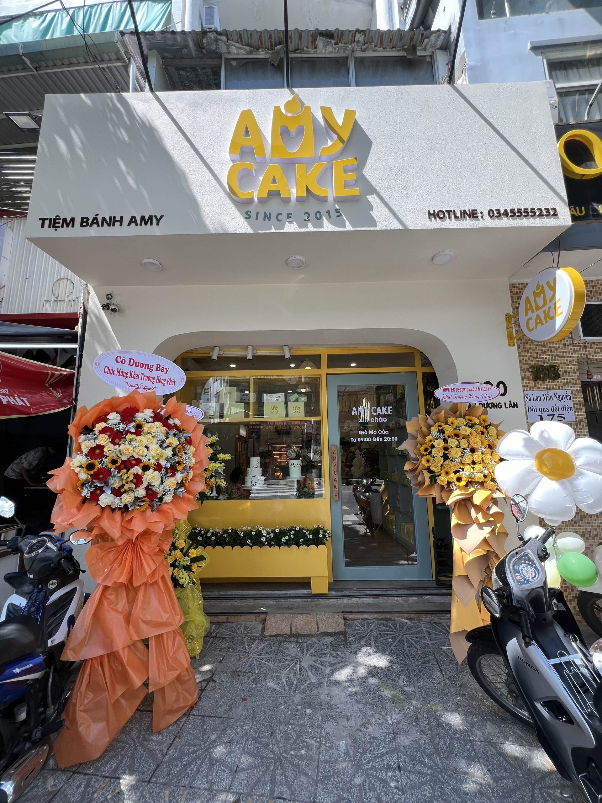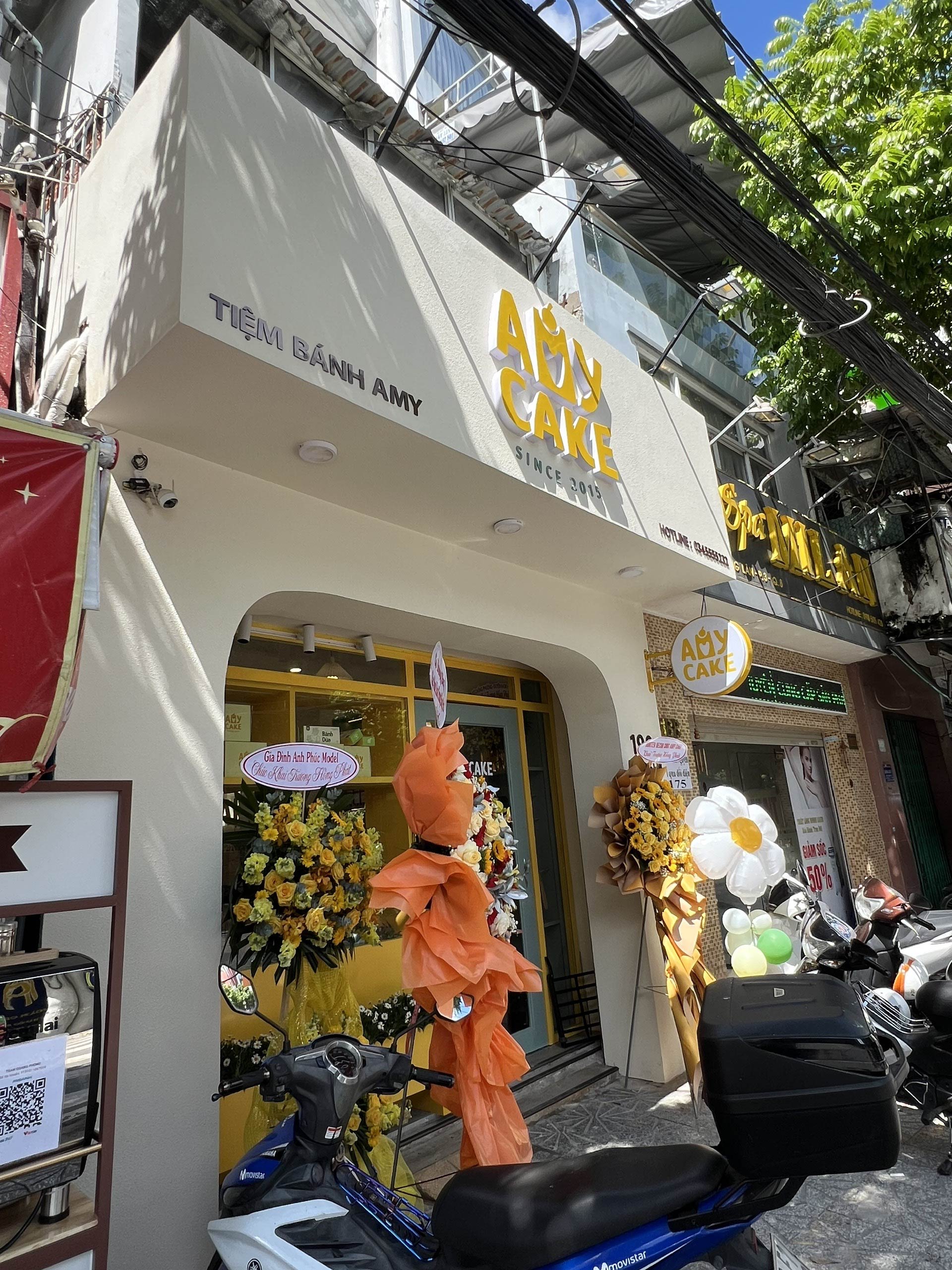 Hunter Decor bàn giao mặt tiền tiệm bánh Amy với thiết kế đầy sức hút. Hệ kính cường lực trong suốt kết hợp cùng bảng hiệu tinh tế, làm nổi bật không gian trưng bày bánh ngọt đầy nghệ thuật bên trong. Sự kết hợp giữa ánh sáng ấm áp và vật liệu hiện đại tạo nên diện mạo sang trọng, giúp Amy trở thành điểm nhấn nổi bật trên phố.