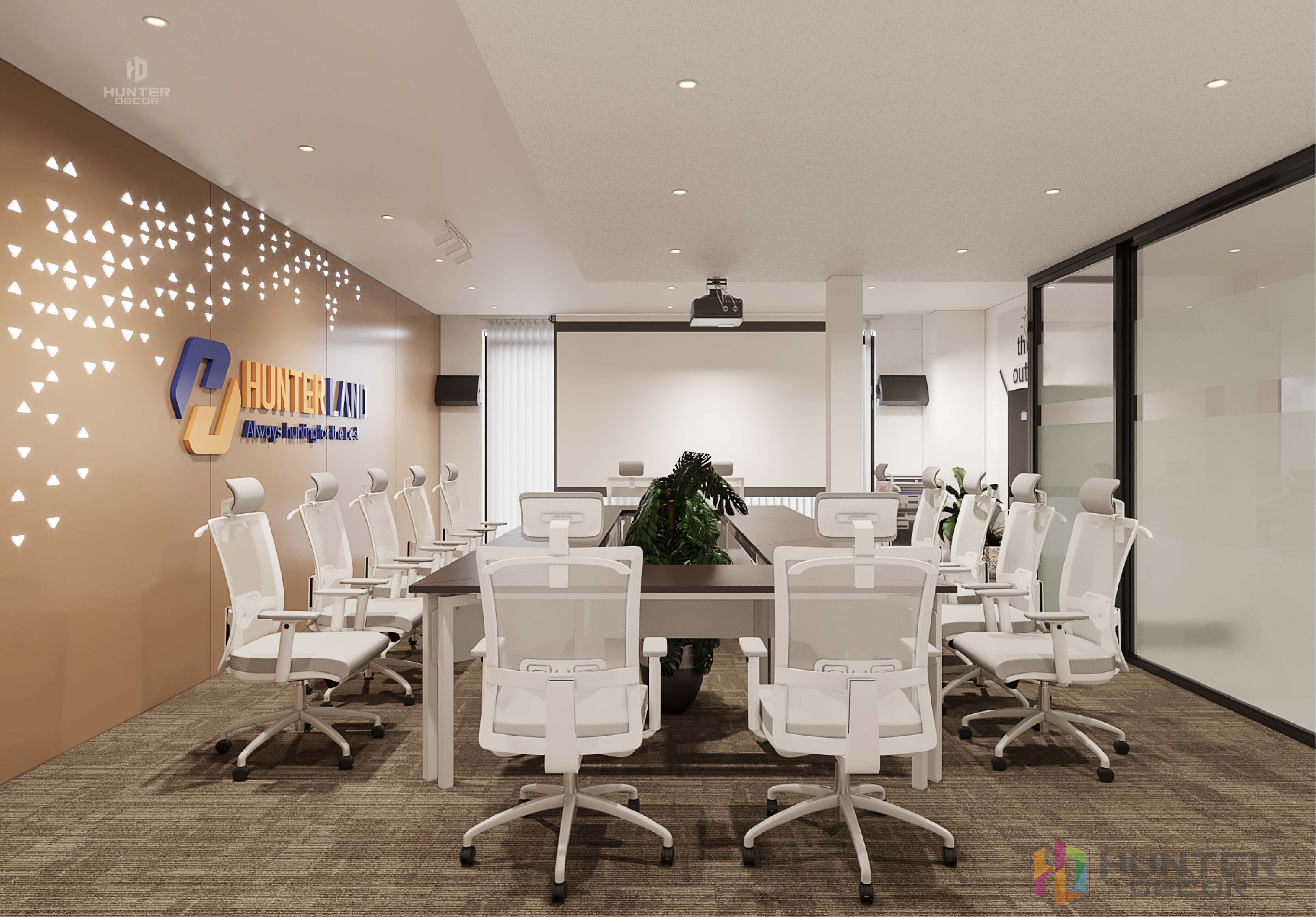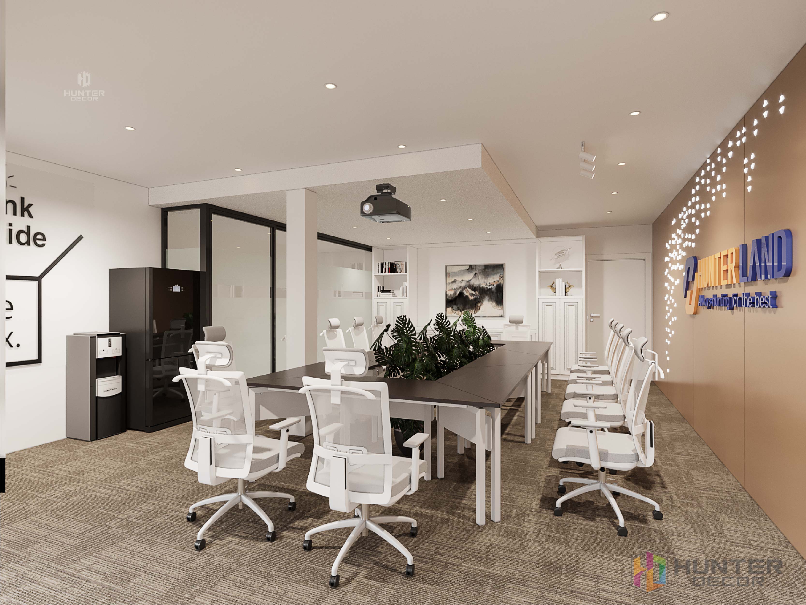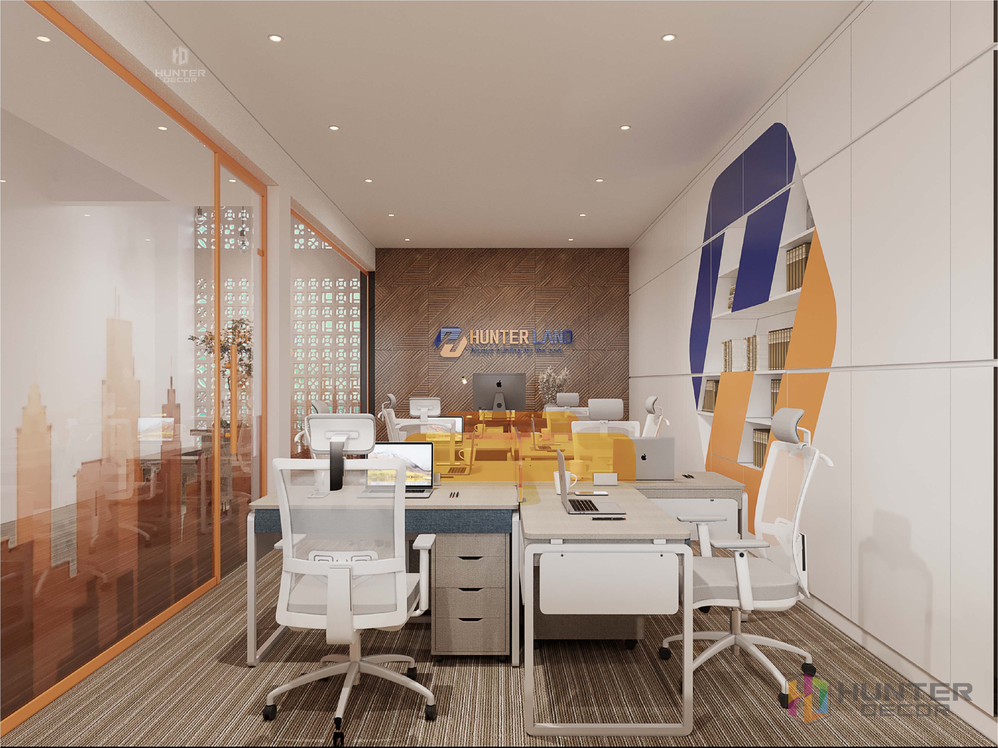 Phòng dành cho Back Office được thiết kế rất khoa học, với tủ để tài liệu nhiều ngăn và rộng rãi phù hợp với nhu cầu sử dụng của khối BO. Tủ đựng tài liệu được thiết kế rất tinh tế khi lồng ghép vào đó biểu tượng logo công ty. Nó vừa có tính thẩm mỹ vừa thể hiện tinh thần làm việc và sự quyết tâm của đội ngũ Hunter.