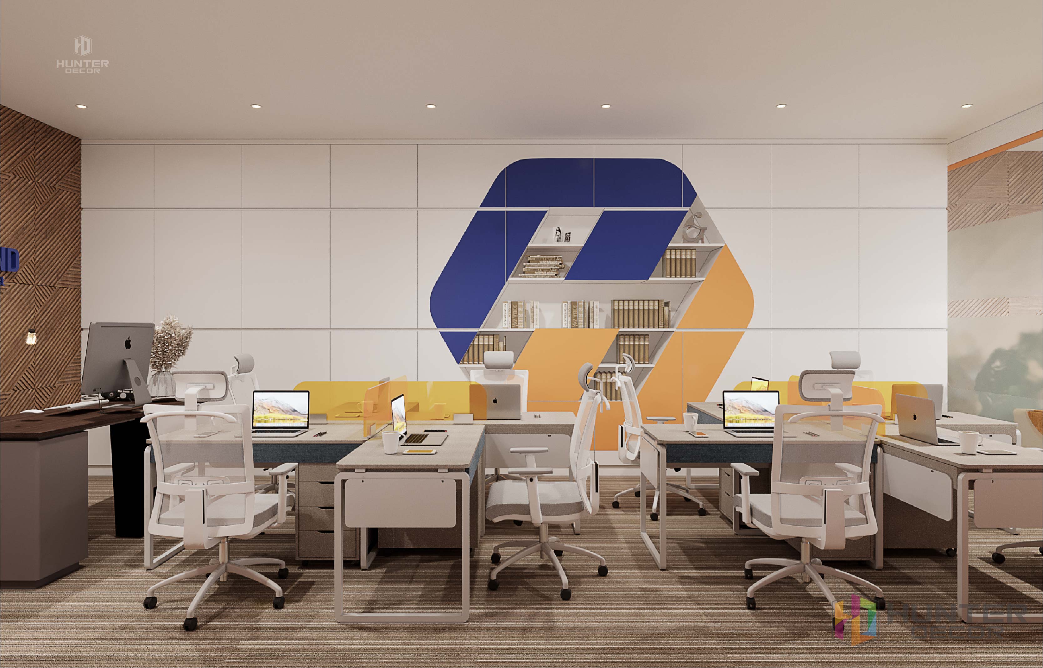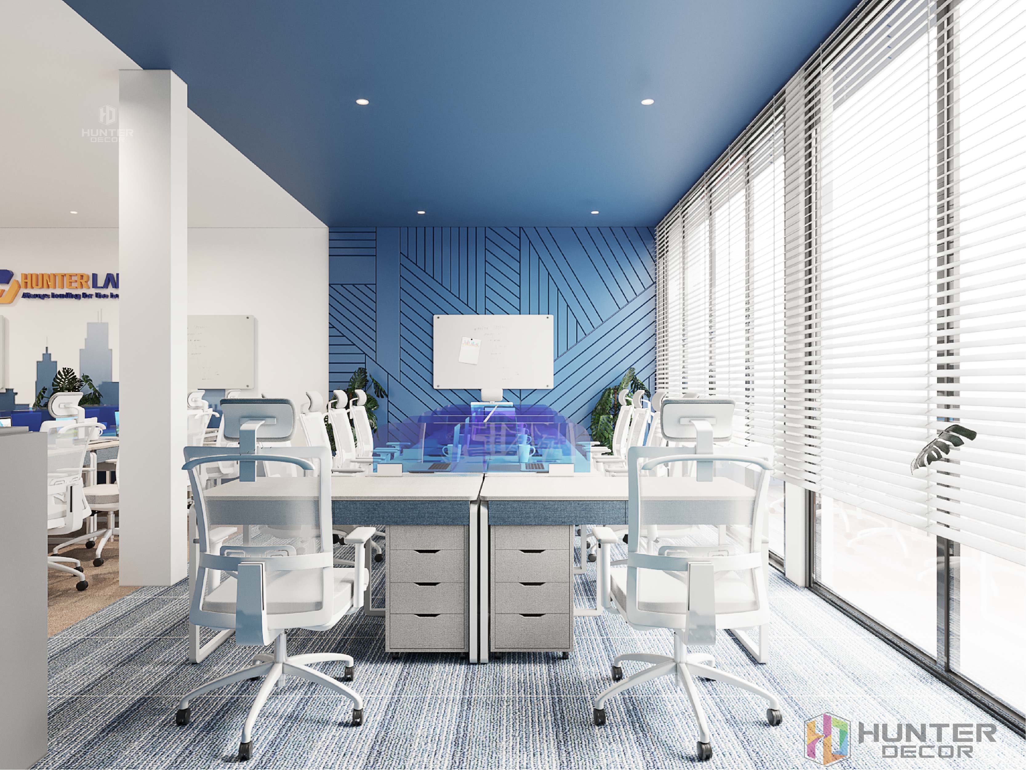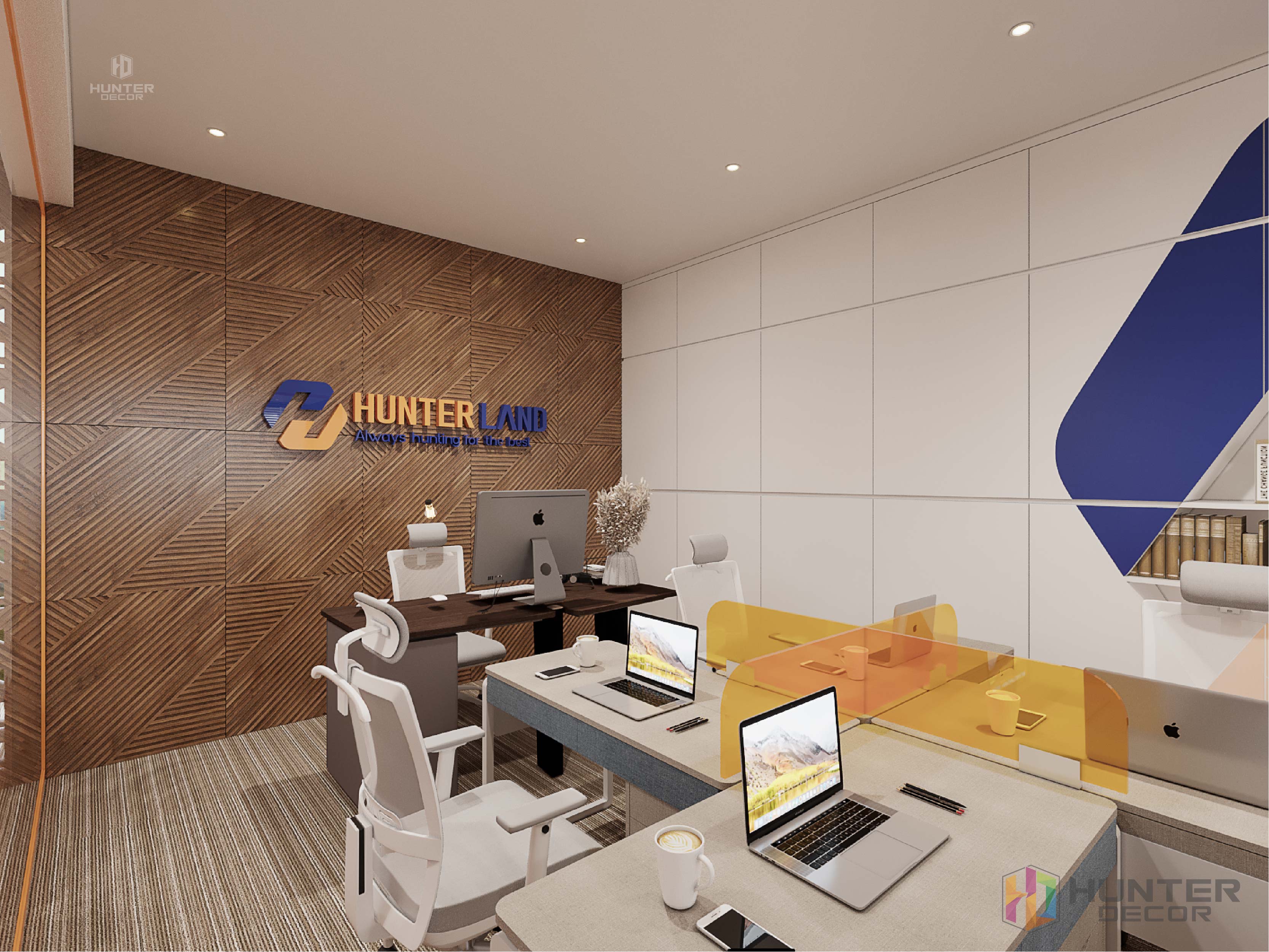 Phòng làm việc của bộ phận B.O nổi bật với hệ tủ lớn cùng hệ cánh tủ sơn logo công ty Hunter Land.
