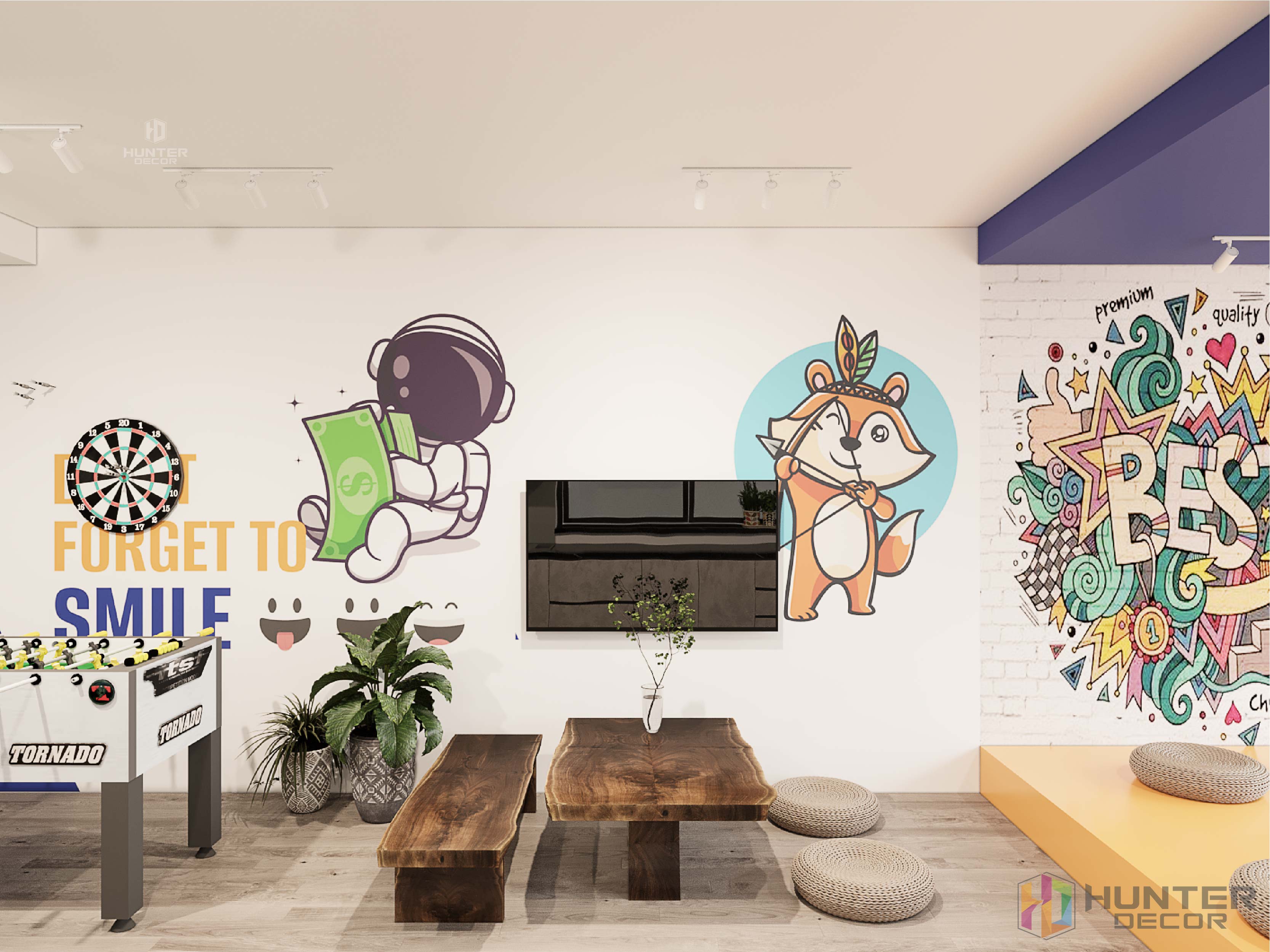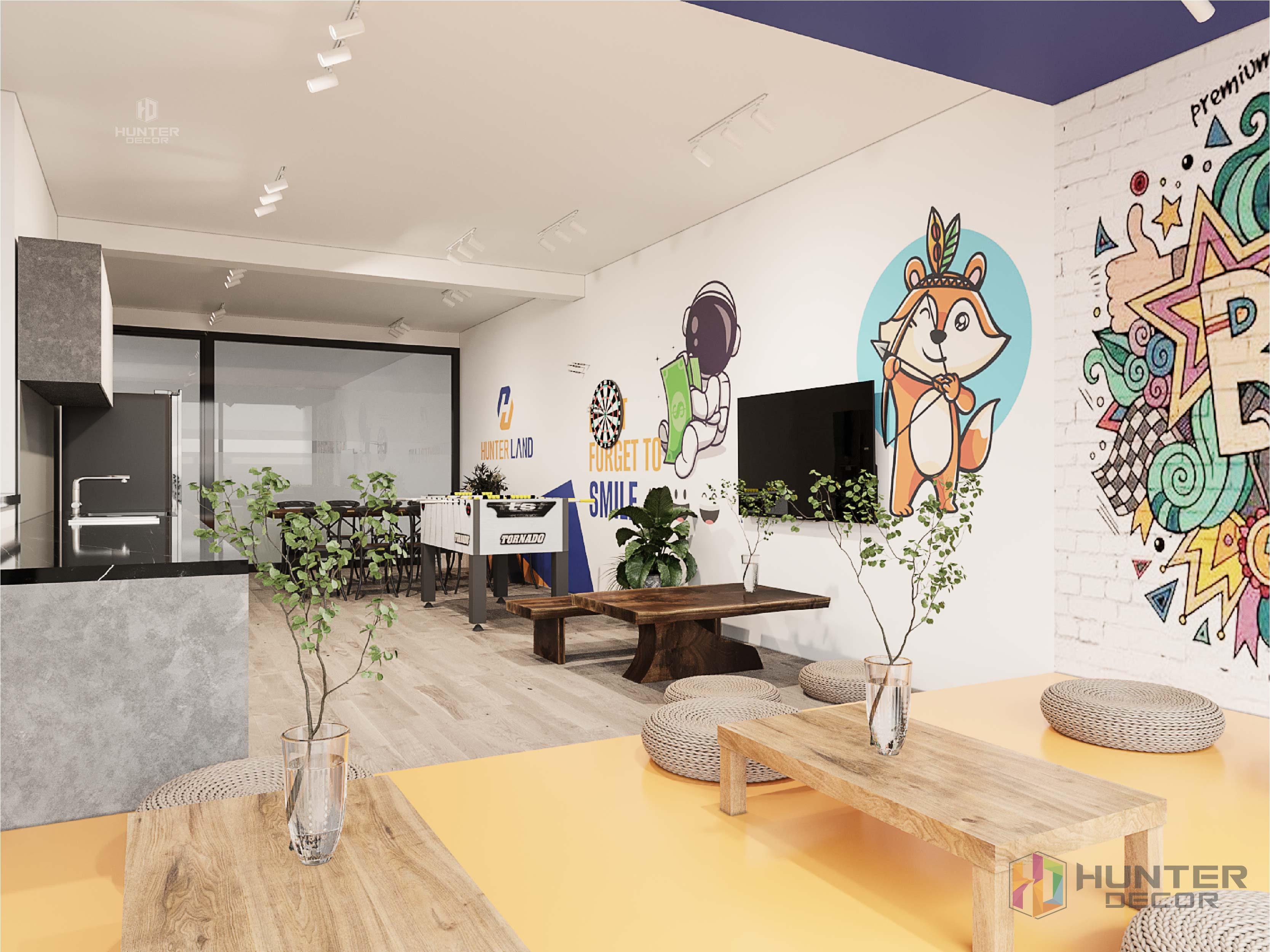 Ngoài ra, khu vực này còn là nơi vui chơi giải trí của nhân viên. Sau những giờ làm việc mệt mỏi, nhân viên có thể giải trí cùng nhau với bàn bi lắc để giải tỏa căng thẳng. Trên tường cũng được trang trí với nhiều sticker vui nhộn, bắt mắt làm không khí căn phòng trở nên tươi mới hơn.