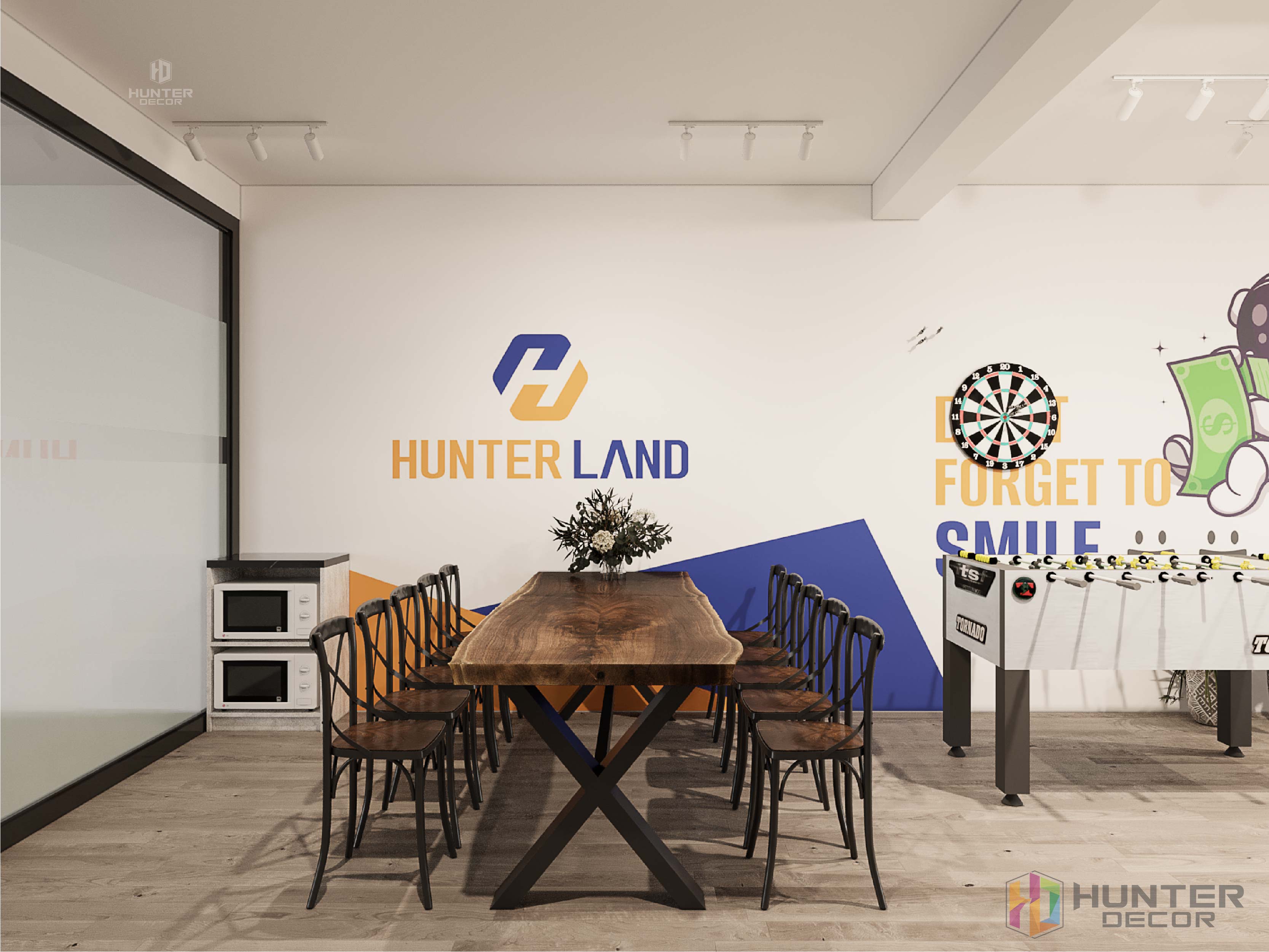Logo công ty Hunter Land nổi bật tại bàn ăn.